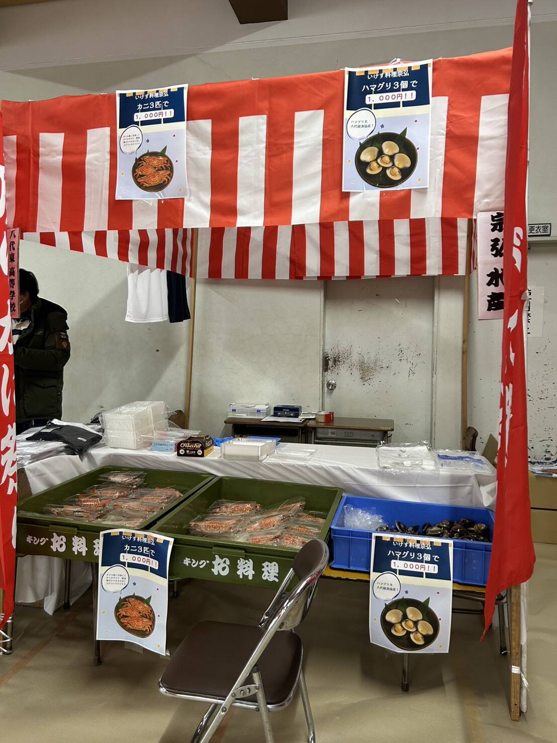 ブースでは 同窓会オリジナルTシャツ をはじめ、いけす料理宗弘様のご協力によるカニとハマグリの販売 を行いました。